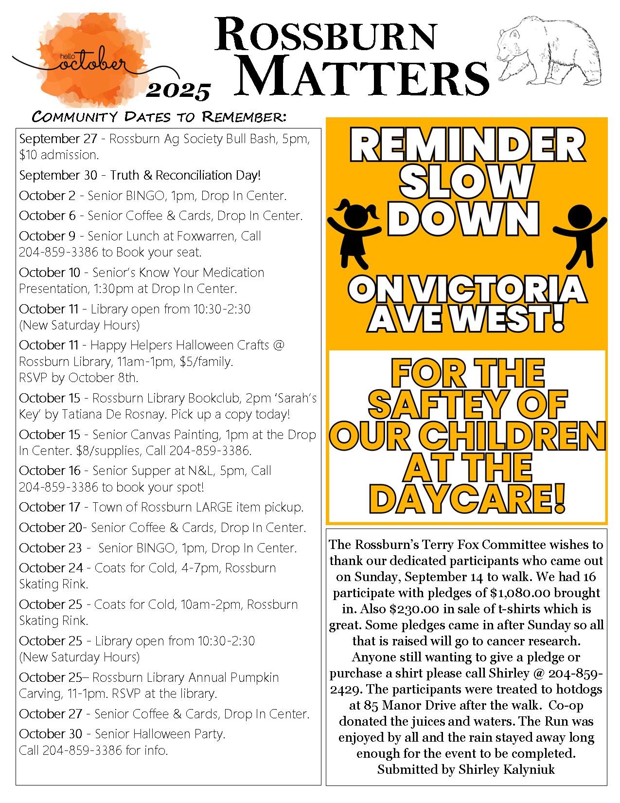 If you have something to share please email your news article, event happenings and pictures to be included in the next Rossburn Matters to Alicia Grassinger at rossburnmatters@hotmail.com Deadline is the 15th of each month for inclusion in the next month's newsletter.